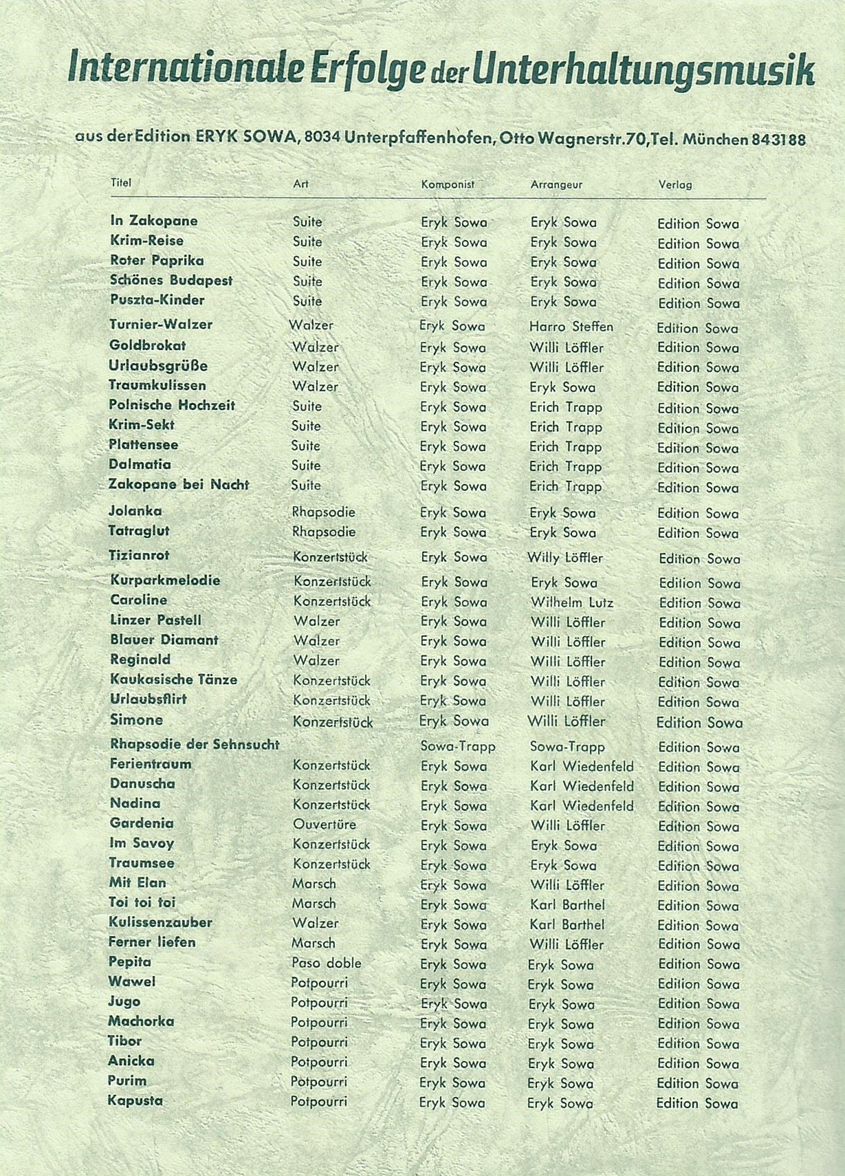 Eryk Sowa’s “Turnier-Walzer” ist ein mitreißendes und zugleich elegantes Werk, das die Pracht und Dynamik eines festlichen Balles mit der Anmut eines Tanzturniers vereint. Der Walzer zeichnet sich durch seine raffinierte Harmonik und sein lebendiges Tempo aus und vermittelt den Hörer in eine Welt von schwingenden Tanzpaaren, funkelnden Kronleuchtern und meisterhafter Choreografie.